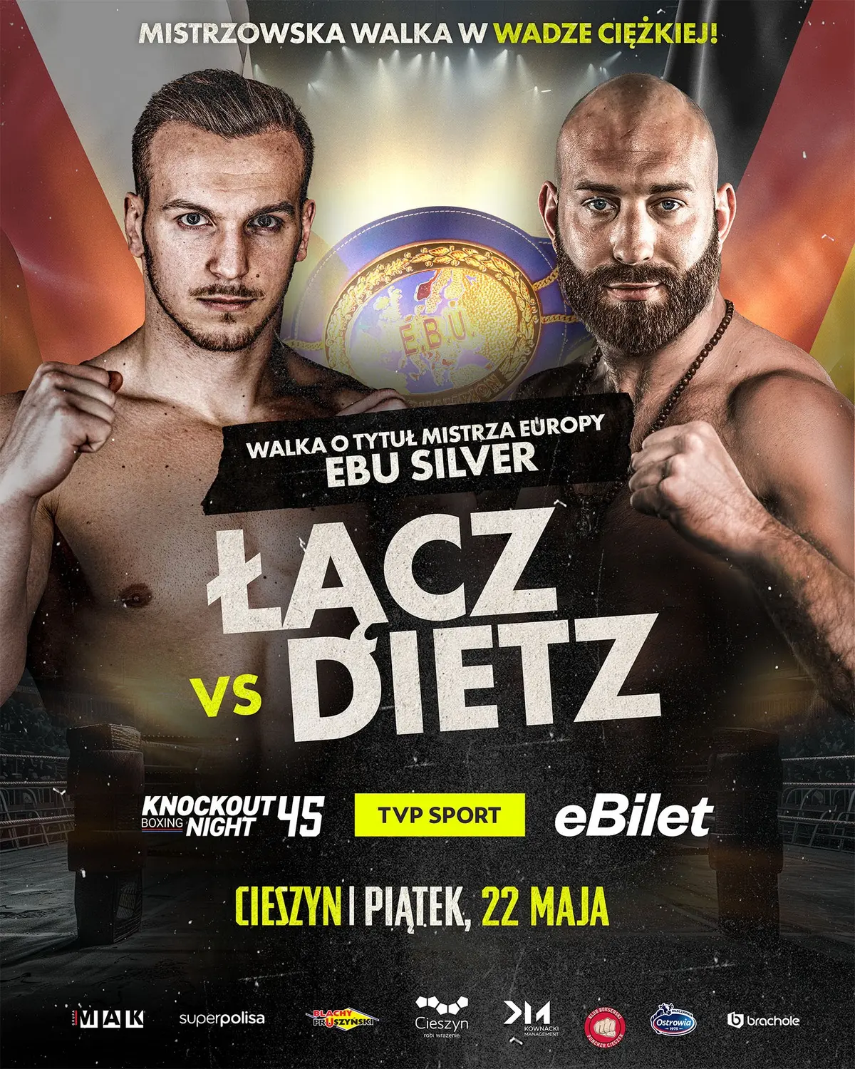Już 22 maja w piątkowy wieczór w Cieszynie, czeka nas mistrzowska gala boksu zawodowego, Knockout Boxing Night 45! W walce wieczoru to, co kibice lubią najbardziej! Pojedynek w królewskiej wadze ciężkiej, a jego stawką pas Mistrza Europy EBU Silver!